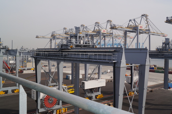 Rail mounted gantry cranes or bridge cranes are used for efficient, space-saving stacking of standard containers in a row. RMG cranes are available in different spans and heights. Between its pillars there is space for about 6-20 containers lengthways.